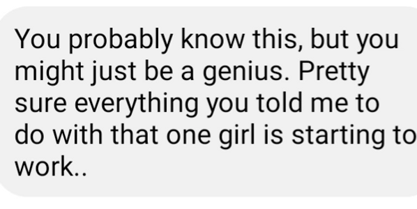Certainty, skills and predictable control over your dating life, whether that's setting up a certain number of dates or getting your ex back. From the very first call, an overview of your dating life and current struggles with women will be discussed at length and a reasonable goal line of achievement will be agreed upon by the both of us. This will depend greatly on your schedule, logistics and personal goals.